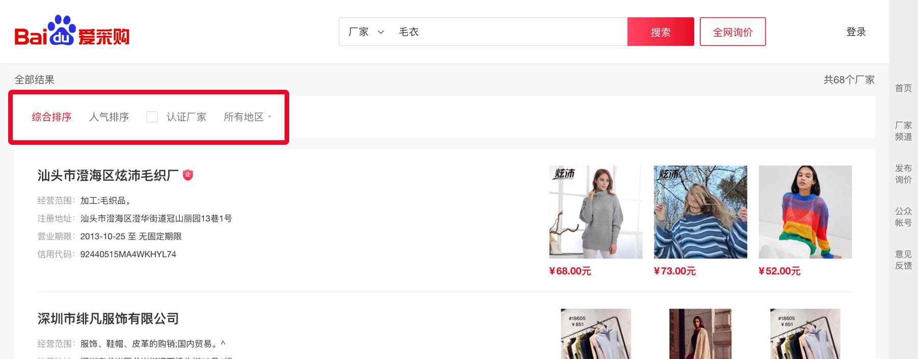 在搜索結(jié)果中,可使用熱門排序和地域篩選功能,方便快速掌握廠家情況;