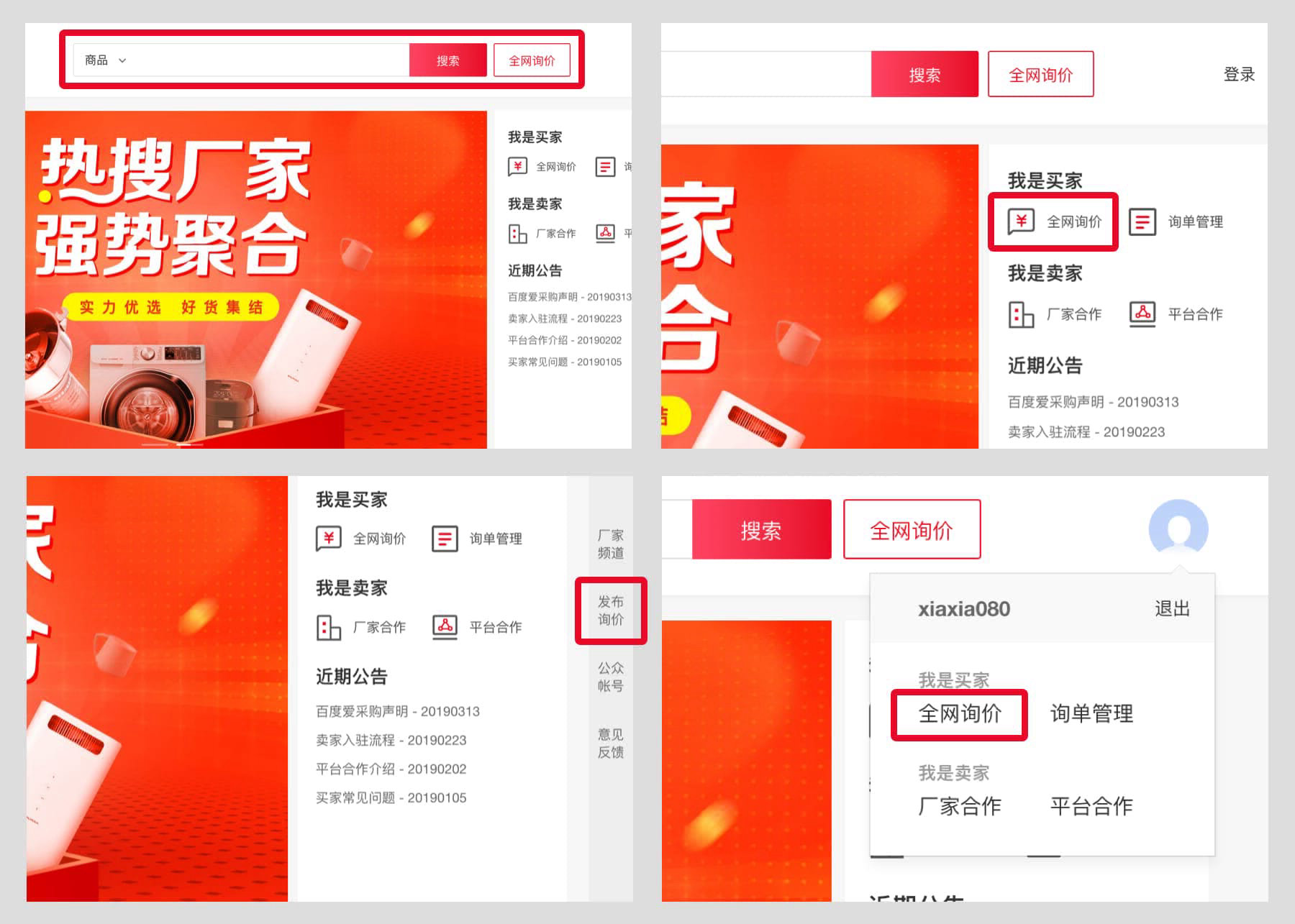 針對于詢價功能,百度愛采購平臺支持買家進(jìn)行全網(wǎng)詢價和指定詢價。