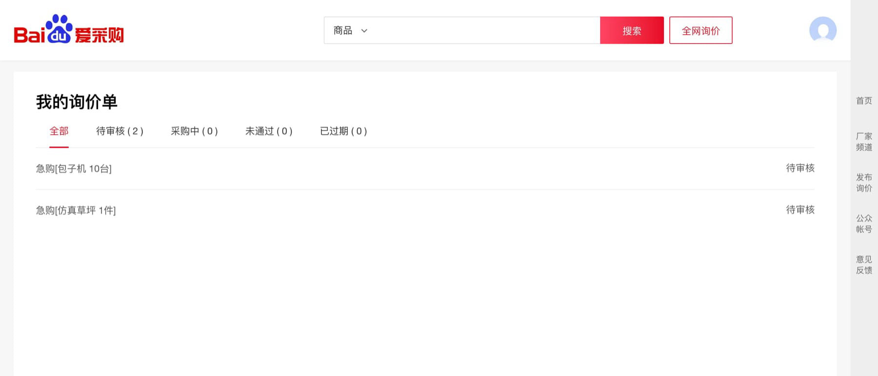 百度愛采購平臺有4處【全網(wǎng)詢價】按鈕,點擊其中任意一個都可進(jìn)入詢價單填寫頁面;完成采購信息填寫并通過審核后,即可在【我的詢價單】中查看相關(guān)廠商的報價。