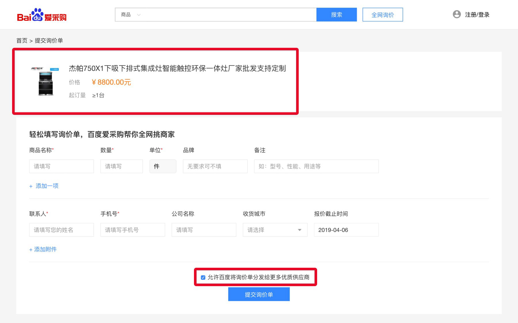 操作也非常便捷,買家只需要點擊商品詳情頁上的【立即詢價】填寫詢價單即可;買家甚至可選擇紅框中選項,決定是否將此次詢價單信息發(fā)送給更多商家,獲得更多報價進(jìn)行對比。