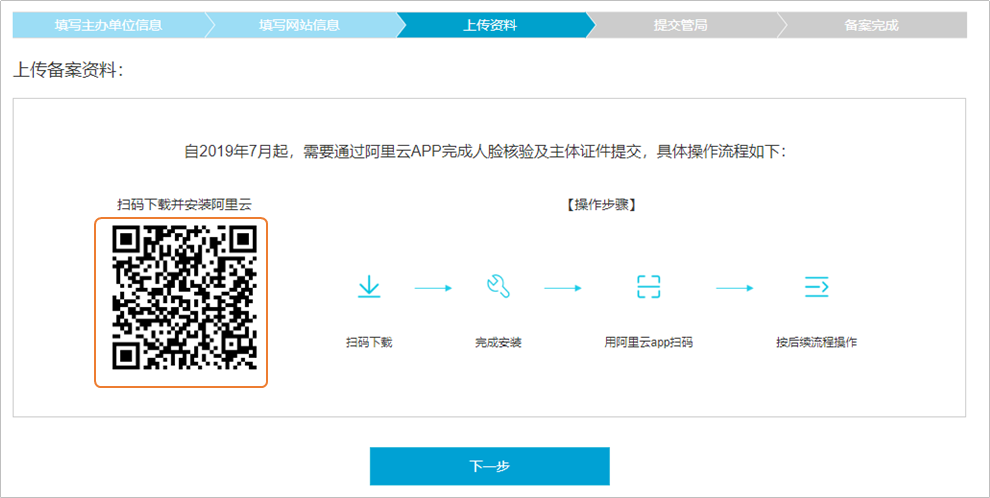 在阿里云ICP代備案平臺填寫備案信息至上傳資料環節,使用阿里云APP掃描二維碼,進入APP端的上傳資料頁面。
